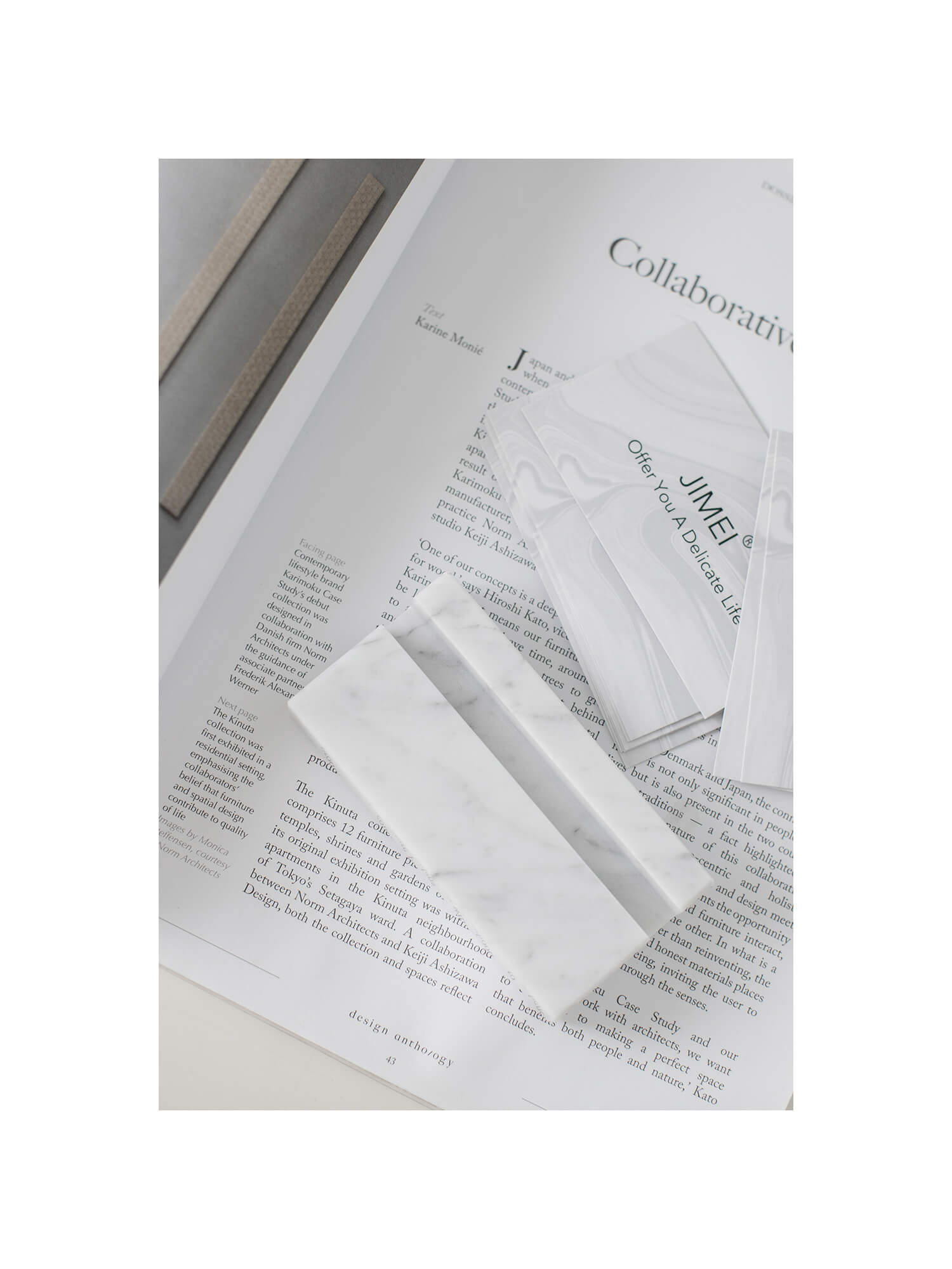 All our smaller accessories are presented in exclusive white packaging designed not only to protect its precious contents during transit, but also to create an elegant aesthetic. We feel privileged to work with natural stone, an incredible gift of Nature, and in turn, we want you to feel as though you are opening a gift when a JIMEI parcel arrives.